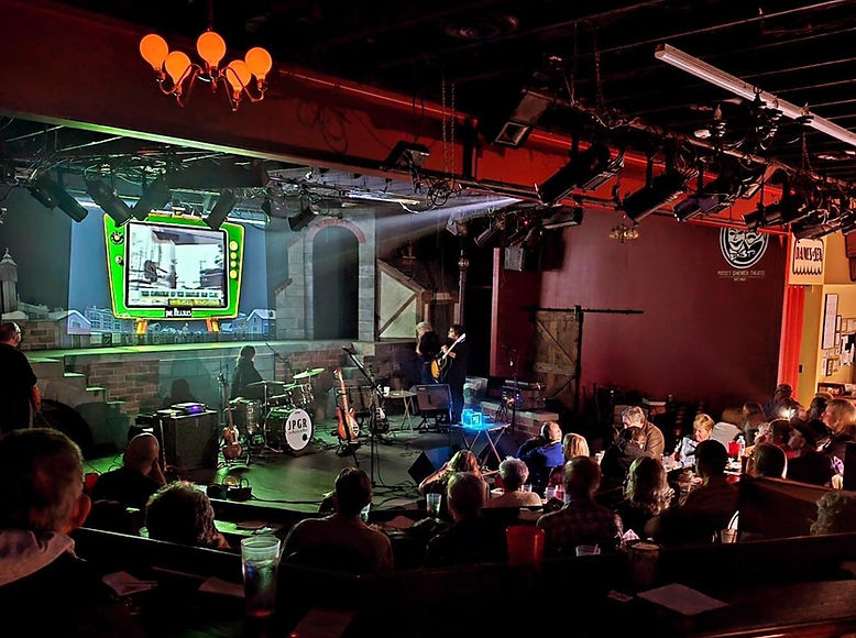 Snug performance venue features boisterous dinner theater served up with American fare & a full bar.